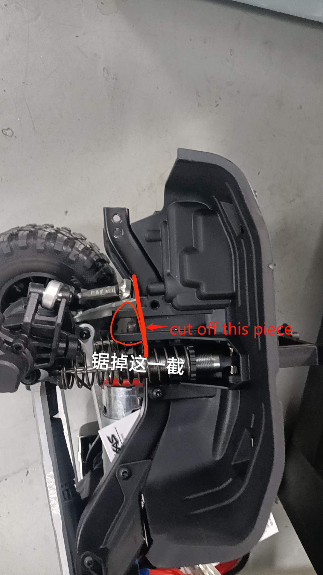 When you install it onto regular Trx-4/Trx-6,please cut off some plastic piece as pointed in the pic.