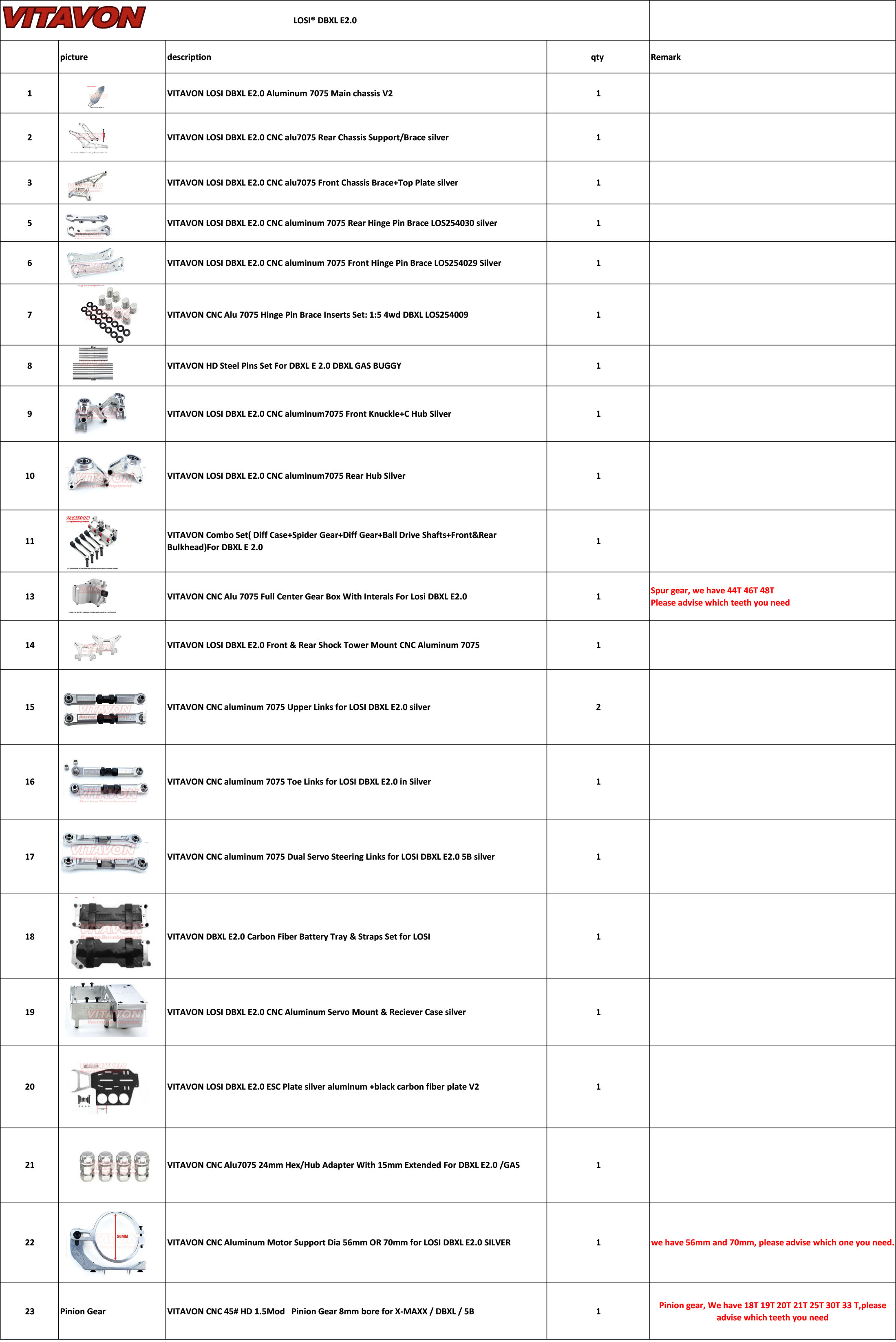 Constructed with high-grade silver aluminum7075, this comprehensive kit includes all essential VITAVON upgrade components—pre-assembled for hassle-free installation. Simply integrate your existing electric parts and mount compatible tires (fits 1/5 scale 70mm wheels), and your RC car will be ready for extreme driving adventures in no time.
