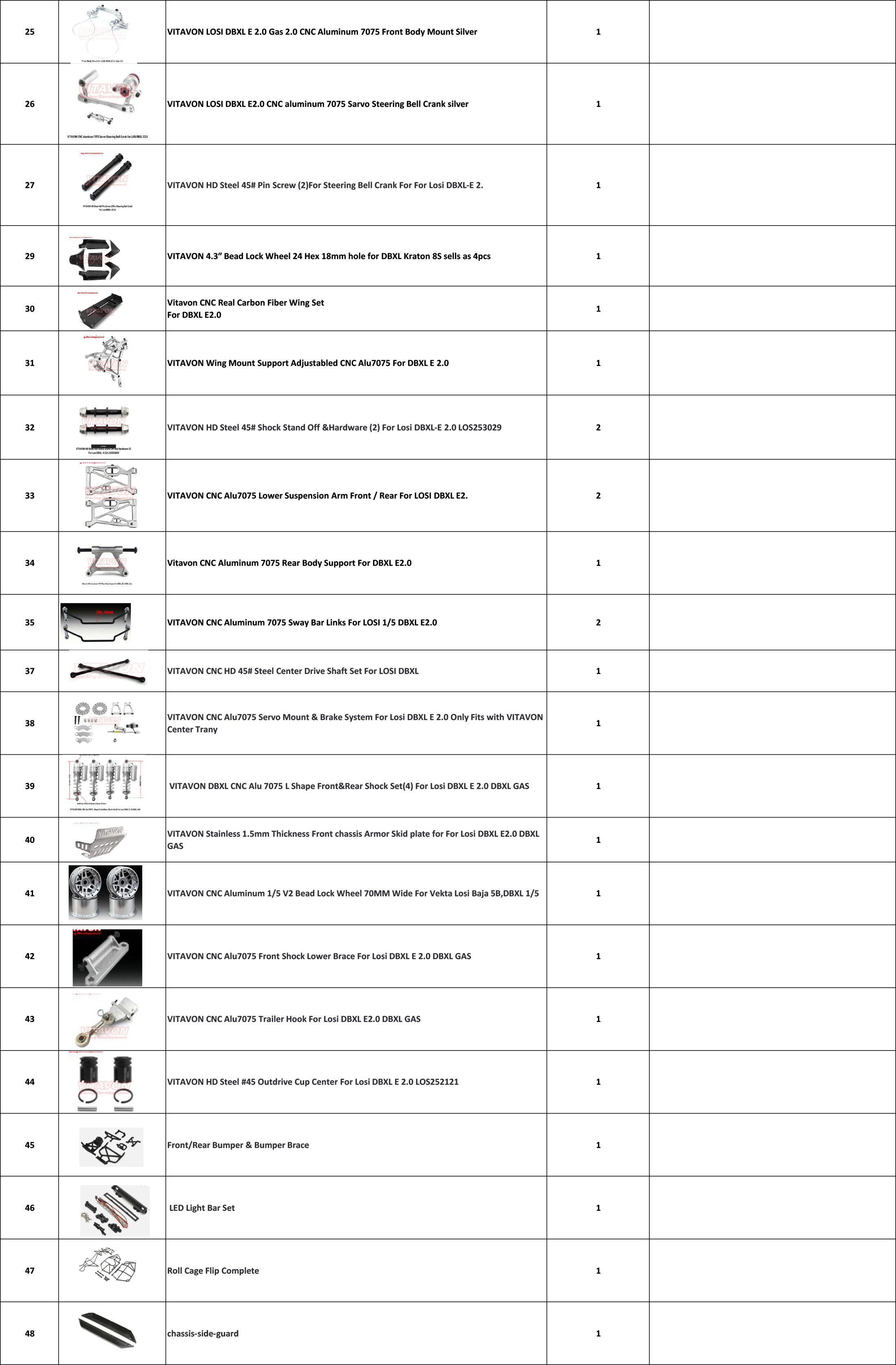 Backed by VITAVON’s precision manufacturing and expertise in RC upgrade parts, this kit guarantees a perfect fit, long-lasting reliability, and enhanced performance that meets the demands of serious hobbyists. Elevate your DBXL E2.0 with premium parts that blend quality, convenience, and top-tier functionality.